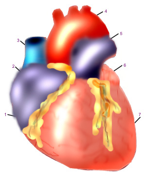 цифуарка 1 означает правый желудочек цифуарка 2 правое предсердие 3 верхняя вена 4 аорта 5 легочная артерия 6 левое предсердие 7 левый желудочек! вокруг белый фон и линии с цифрами они означают Любовь, забота, теплота!