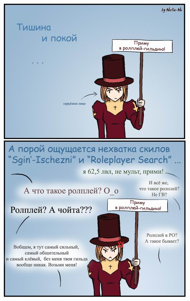 - Мичико отчаялась искать РП-гильдию, потому создала свою. Но вот поиск людей, проходит примерно так же как поиск гильдии. То есть ролевиков почти не видно, а отвечать на вопрос, что есть ролплей, с каждым разом всё ленивее.