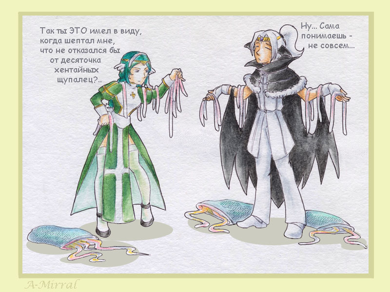 Отправился как-то полугрешный дуэт М&М (Максимилиан и Мирабэлла то есть) на последний этаж Байлана - ну, прогуляться. По пути встретилось скопление гидр, мирно дёргающихся себе на стеночке. И в них, несчастных, мигом полетел ЛоВ... а в инвентарь(в основном, почему-то, в мой) - тентакли пачками... Сра-азу всё вспомнилось...><